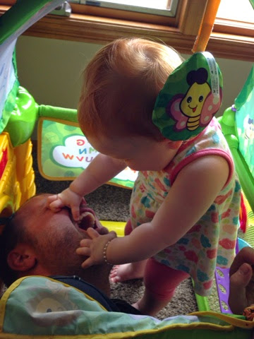 These two were a riot Sunday afternoon. Evs thought it was so fun to climb on daddy's back, give him a dental exam, use his face as a step, and try to cut off blood flow to his carotid artery, by constantly kneading his neck with her tootsies. After beating daddy up, both thoroughly enjoyed snuggles before their afternoon nap.